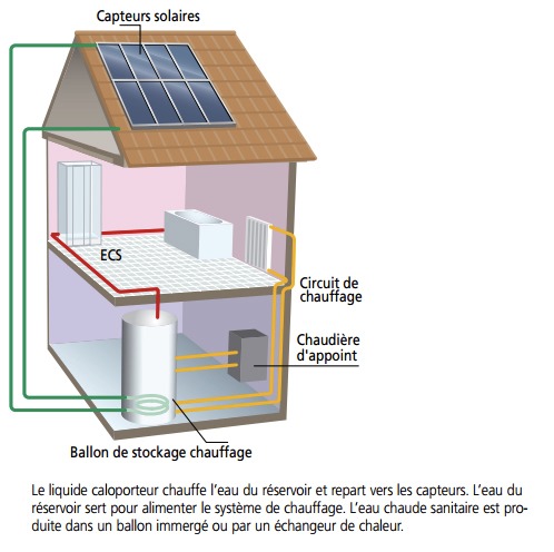 Le système solaire combiné est une installation utilisant le rayonnement solaire pour couvrir une partie des besoins en chauffage et en ECS (eau chaude sanitaire). Il associe le chauffage de l’eau sanitaire et le chauffage de l’habitat. Cette installation est capable de répondre à 50% de vos besoins en chauffage et eau chaude sanitaire. Pour information, la surface nécessaire de capteurs au bon fonctionnement du système est de 1/10ème de la surface du logement.